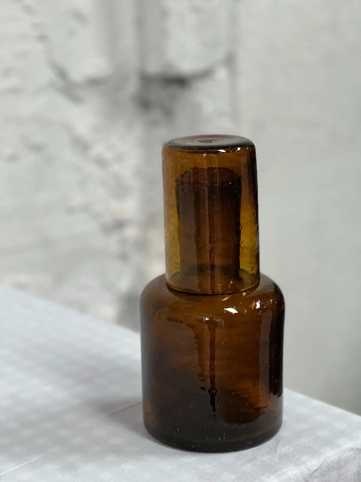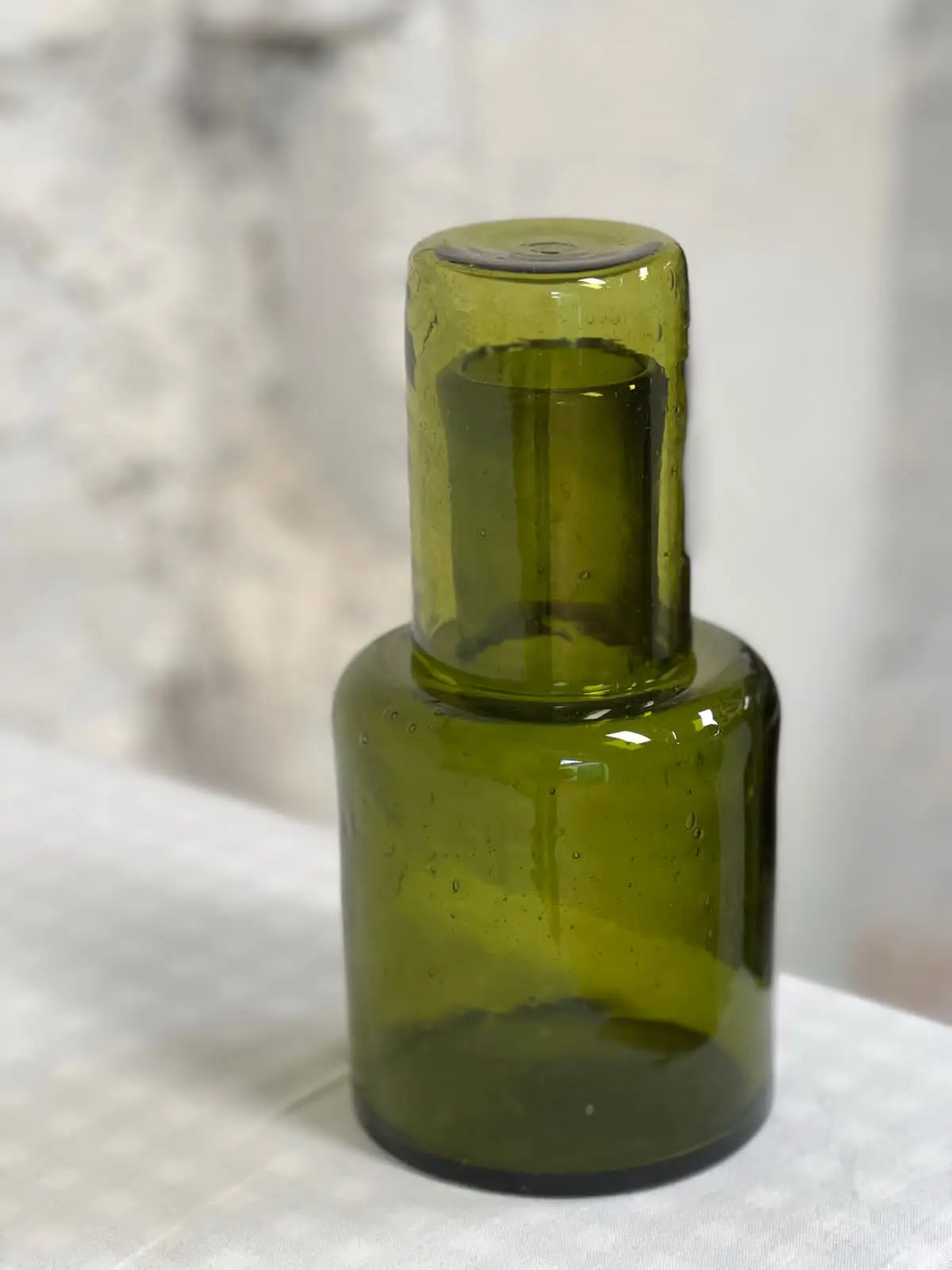 Elegant recycled glass bedside water carafe with 1-litre capacity. Available in green, olive, and brown tints, this sustainable vessel keeps fresh water at hand while reducing single-use plastic waste.
