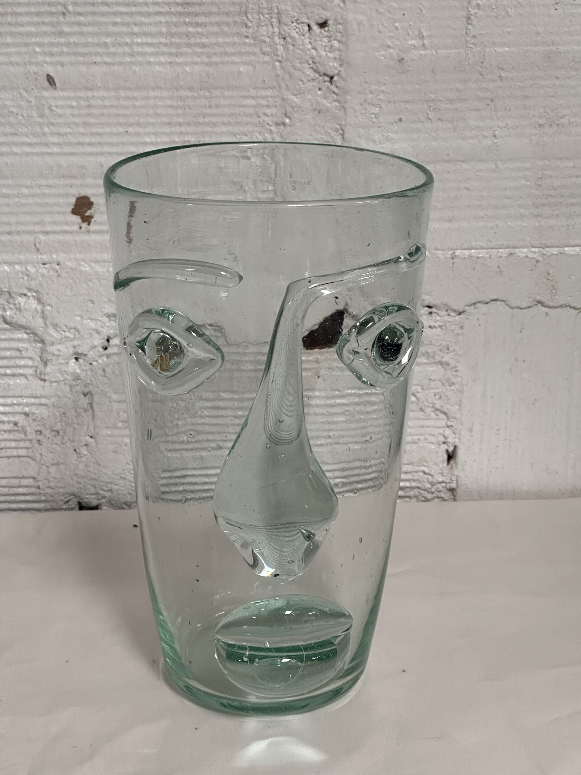 Artistic recycled glass vase featuring a distinctive face design. Available in brown and clear tints, this eco-friendly accent piece works as both functional drinkware and decorative art.