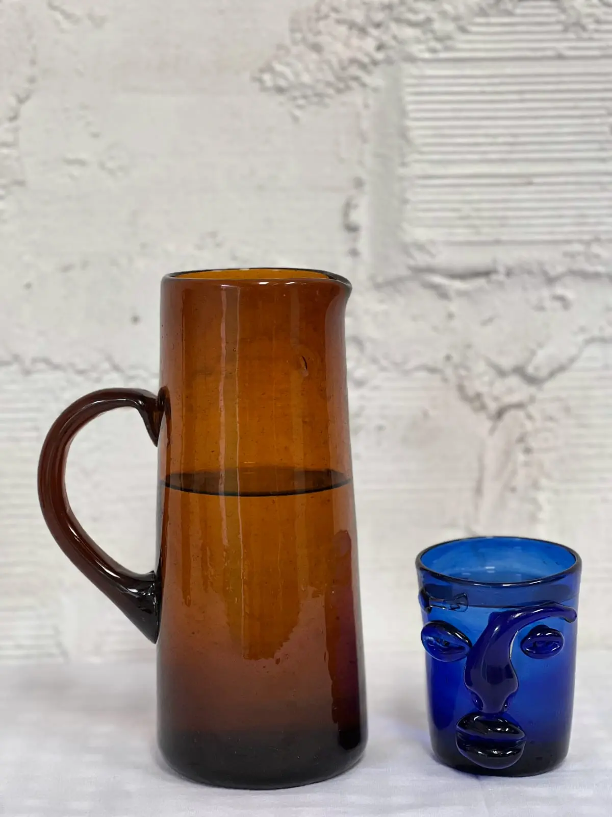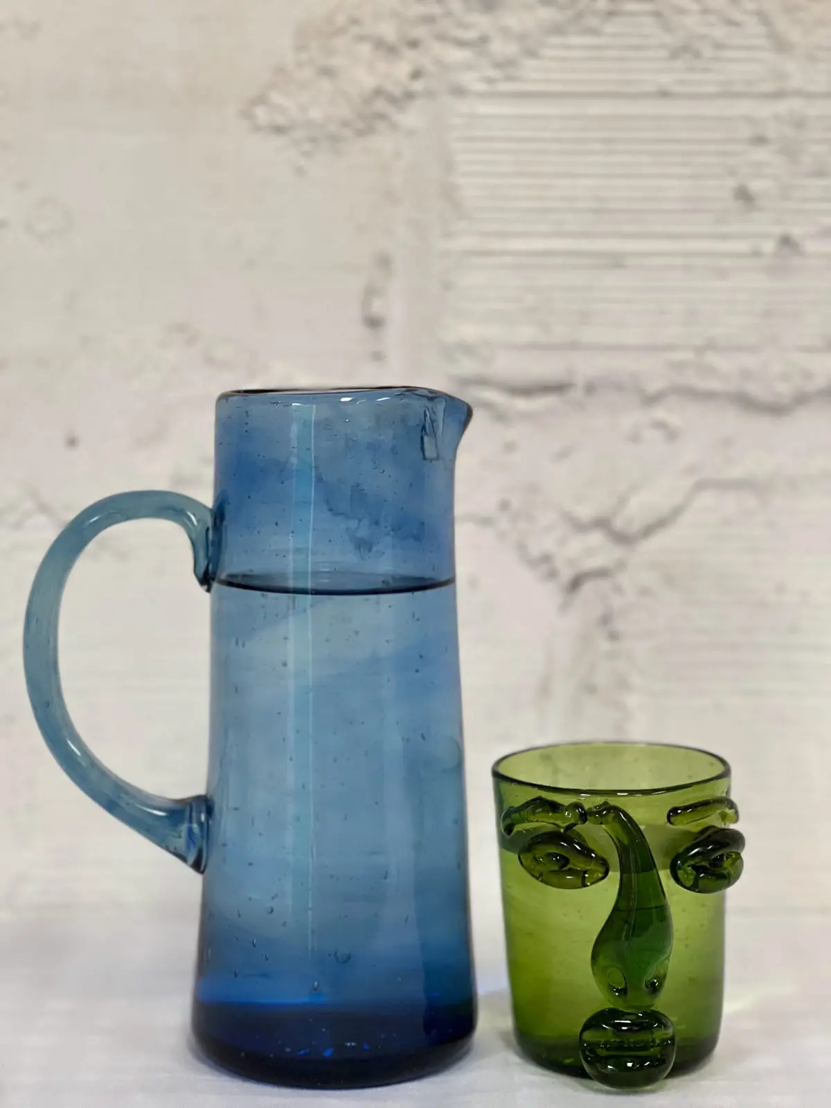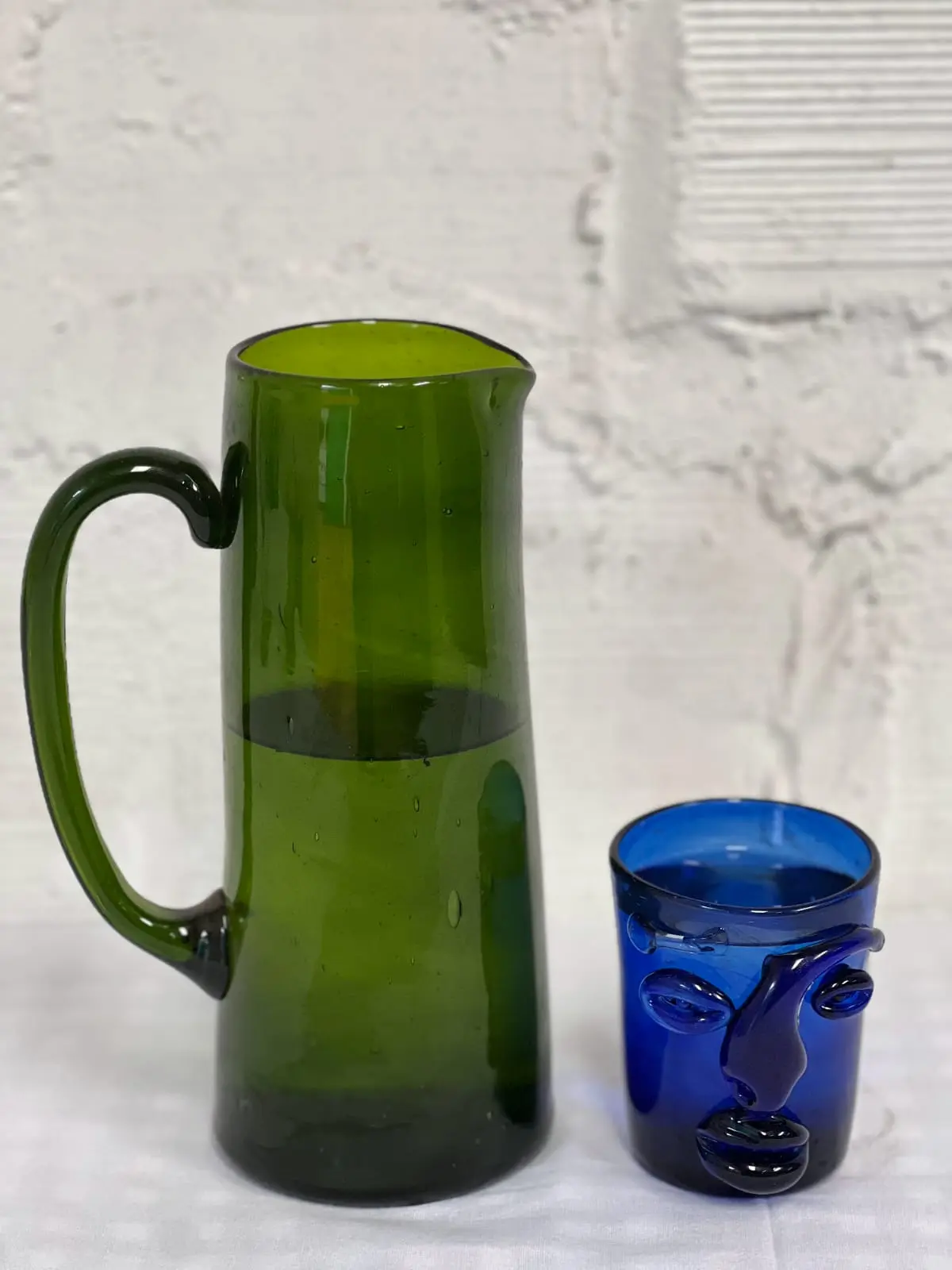 Available in clear, green, brown, and blue variations, each pitcher showcases the beauty of repurposed materials while reducing waste. The triangular design offers not just visual appeal but also a comfortable grip when pouring.